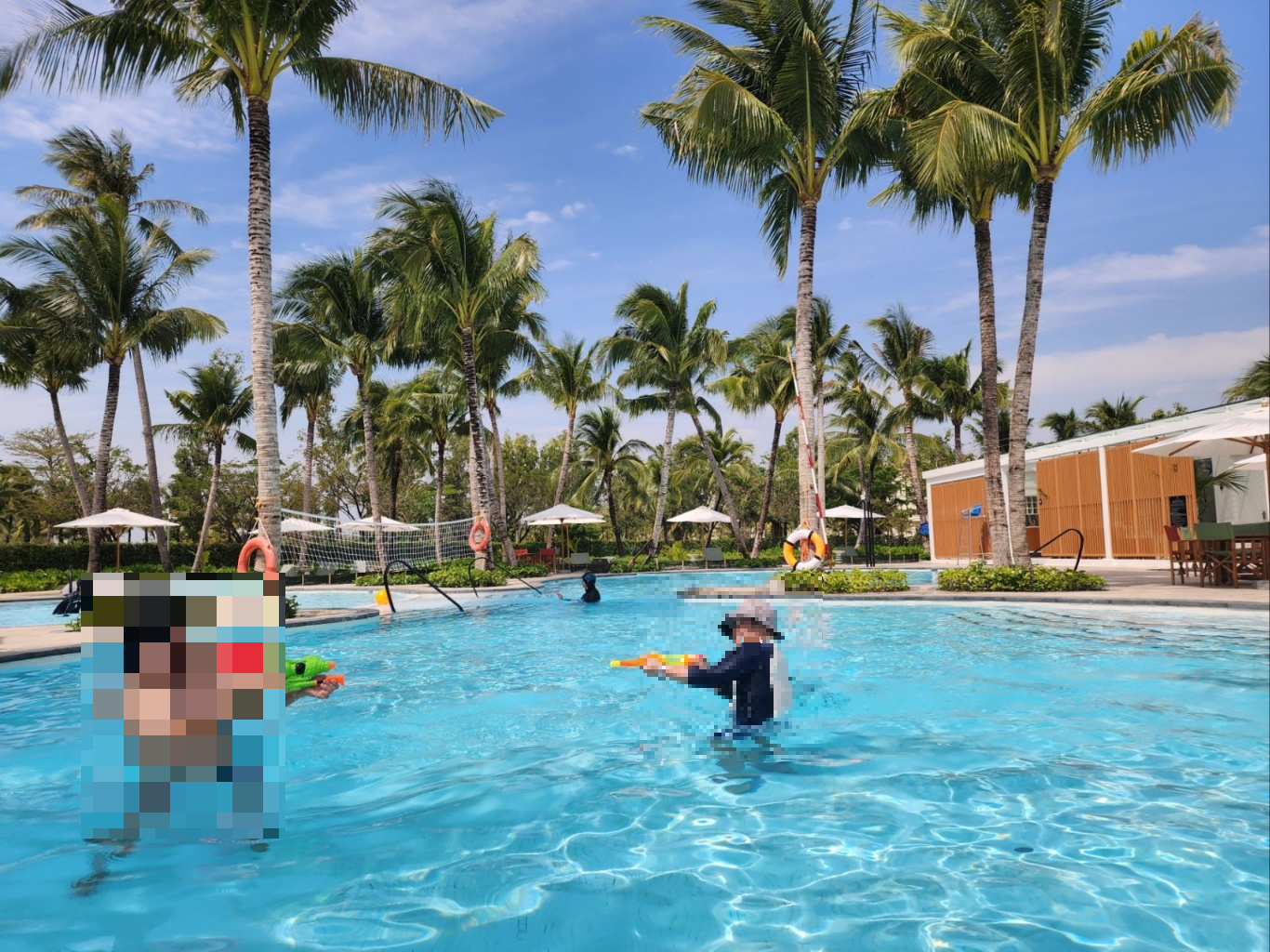 객실 내 수영장에서 수영과 물놀이를 즐기며