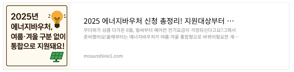 | 2025 에너지바우처 신청 총정리! 지원대상부터 금액까지 한눈에 (1) | 2025.06.10 |
